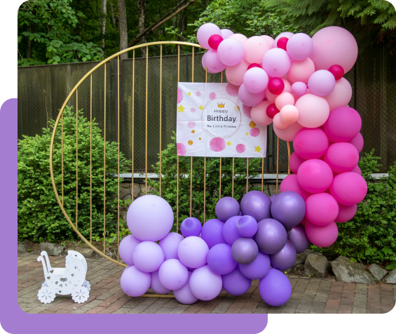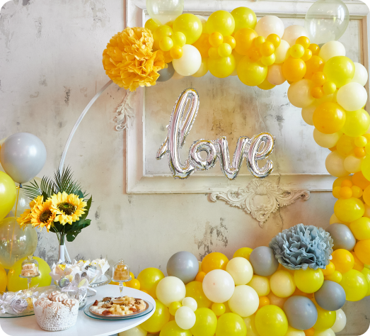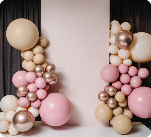 קירות בלונים, קשתות כניסה, בלוני הליום עם כיתובים ושילובים של פרחים, בדים ואלמנטים מסורתיים – הכל נתפר במיוחד לאירוע שלכם.